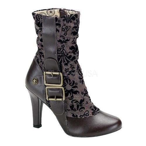 Heel Height: Approx. 4'' Tall. This high heel Tesla boot is Victorian inspired but hip enough for a night out. This mid calf boot has a multi-textural design with a metal buckle detail. It has a side zipper so it's easy to take off and put on. It features a stunning patterned tweed and a subtle metal fleur-de-lis detail.