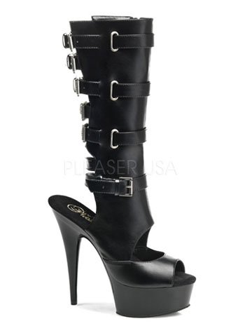 Open toe and open back platform ankle/mid-calf multi buckle boot with a side zipper has a 6 inch stiletto heel and 2 inch platform.
