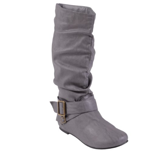 Fashionable buckle and strap details highlight the upper on these mid-calf boots by Brinley Co. These slouchy boots feature a round toe and easy pull-on styling. Faux leather uppers, rubber soles and man-made knit lining complete the look of these boots.